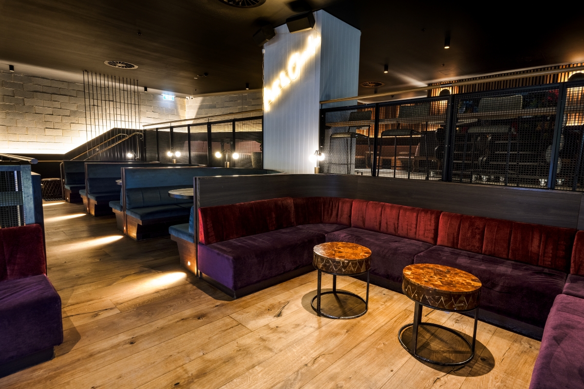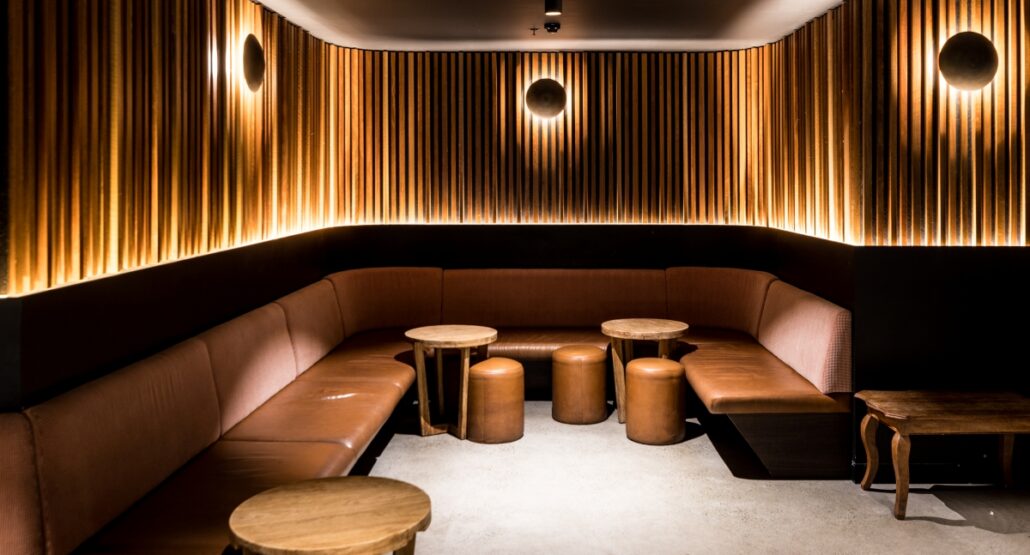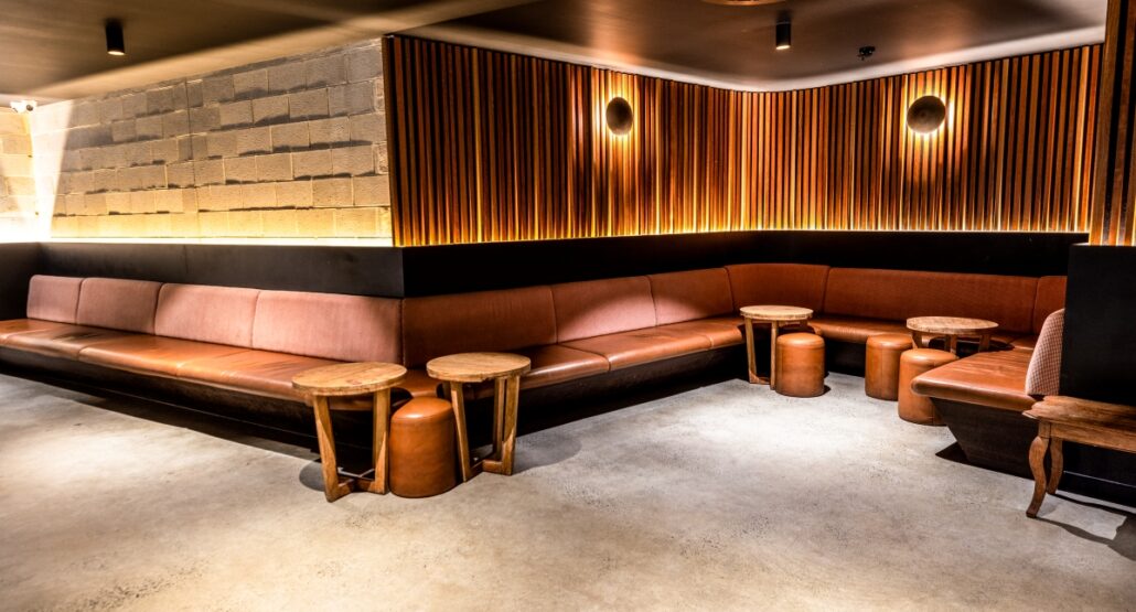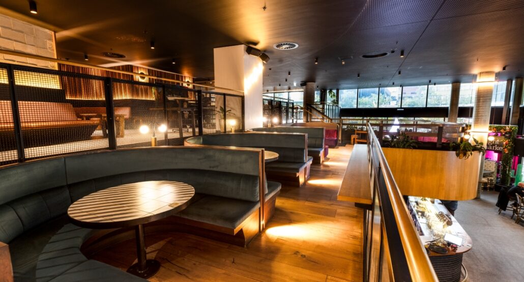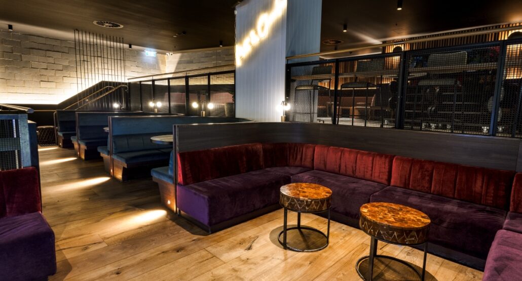 A versatile and semi-private space, ideal for corporate functions or special occasions. A cocktail-style area with surrounding booth seating.