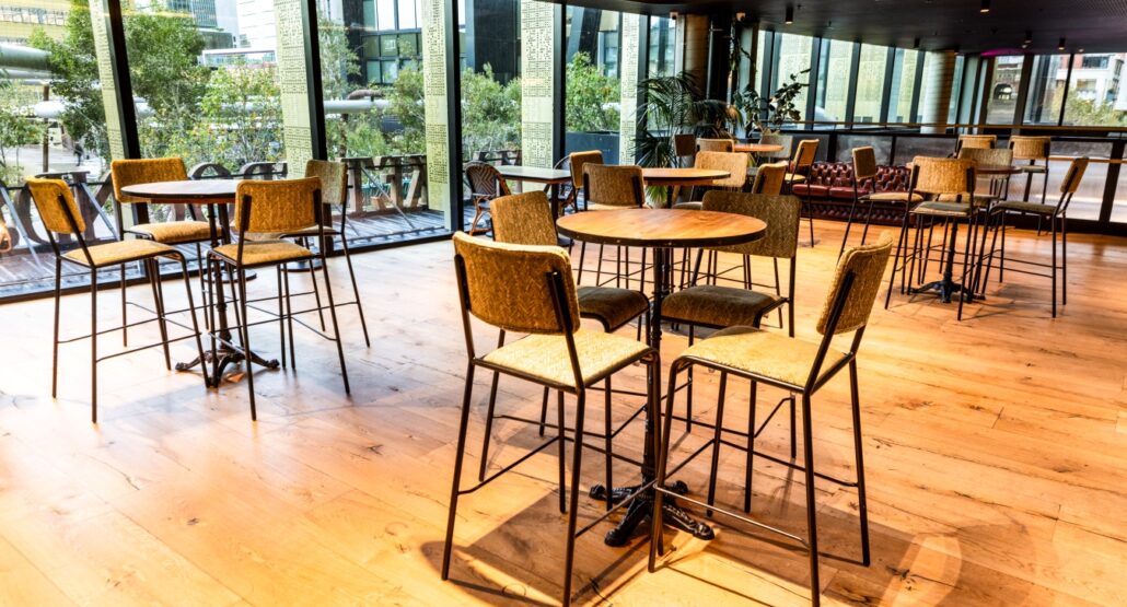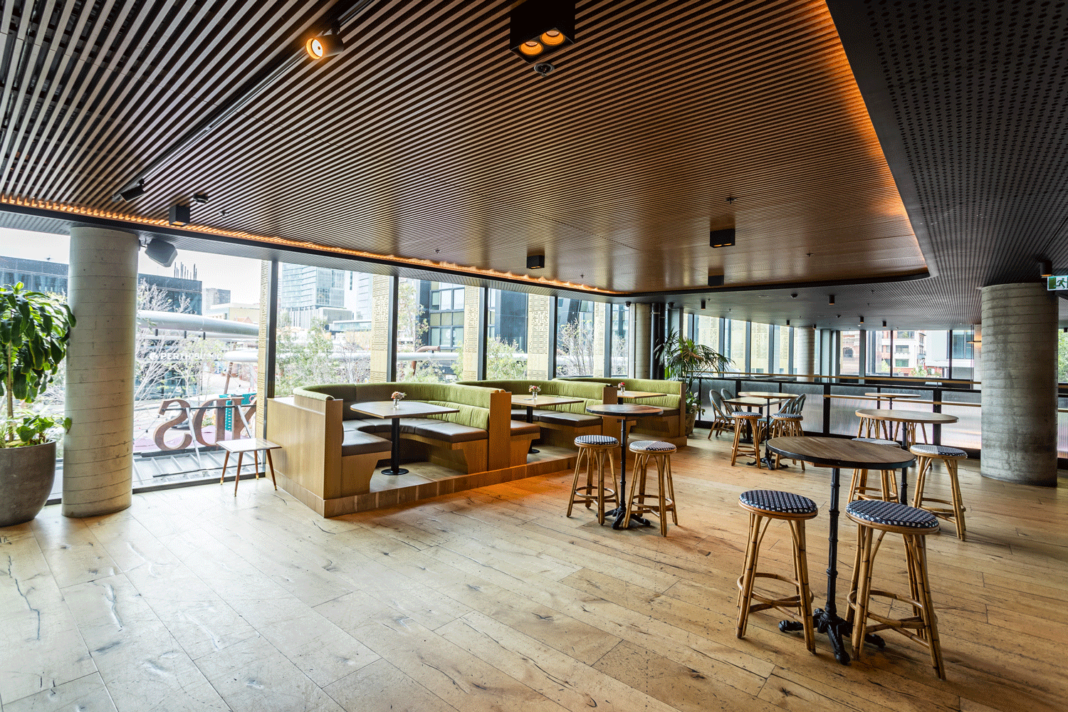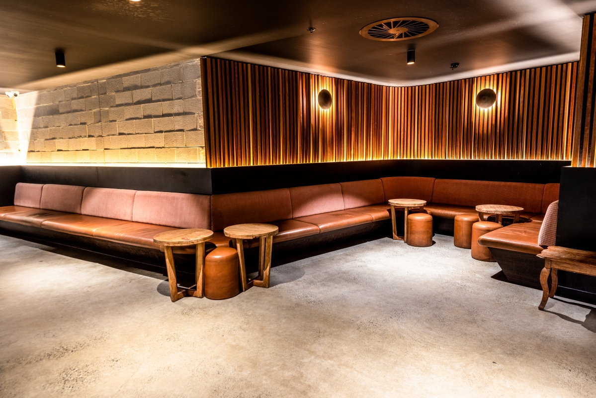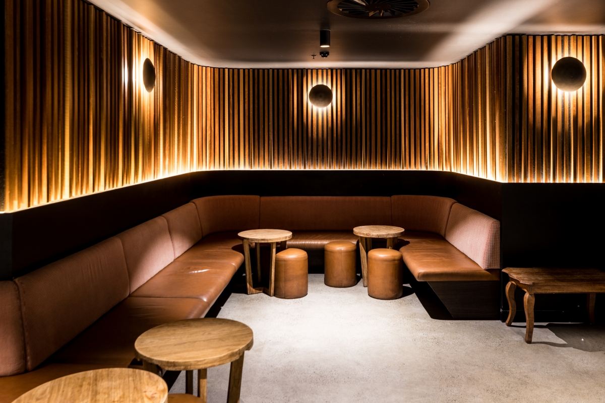 A versatile and semi-private space, ideal for corporate functions or special occasions. A cocktail-style area with surrounding booth seating.